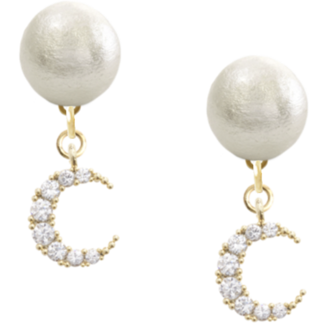 コットンパールのふんわりとした質感と、月型ラインストーンの煌めきが絶妙に組み合わさったこのピアスは、耳元で優雅に揺れ、華やかな印象を演出します。軽やかで着け心地も楽々、カジュアルなコーディネートから特別な日にまで、幅広いスタイルとシーンにマッチします。